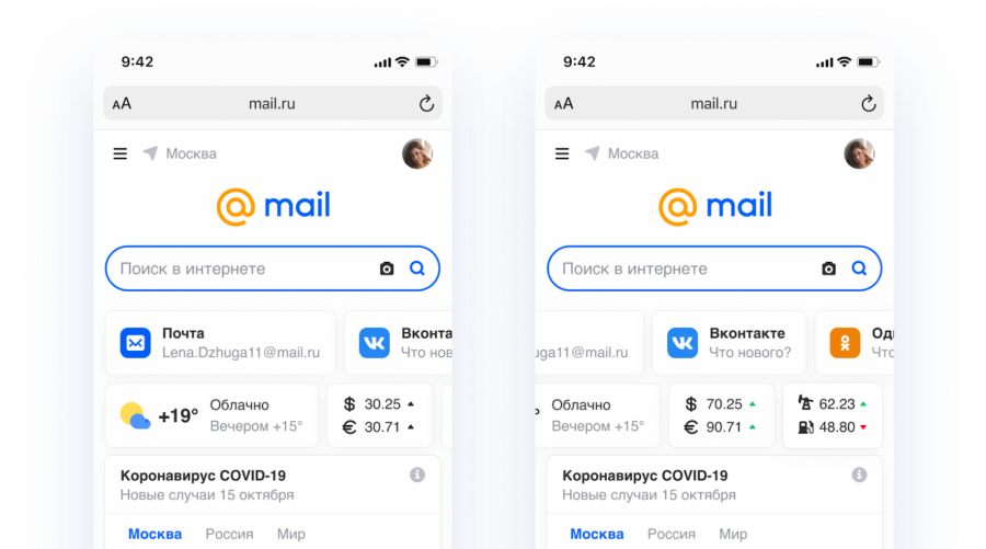 - «Почту» расположили под «Поиском» в виде виджета, чтобы человек не тянулся постоянно наверх. В дальнейшем мы будем выводить не только виджет «Почты», но и календарь, «Облако» и социальные сети. Так пользователь сможет быстро и удобно переключаться между задачами и продуктами. Ниже расположили основную информацию на день: погоду, котировки и новости;