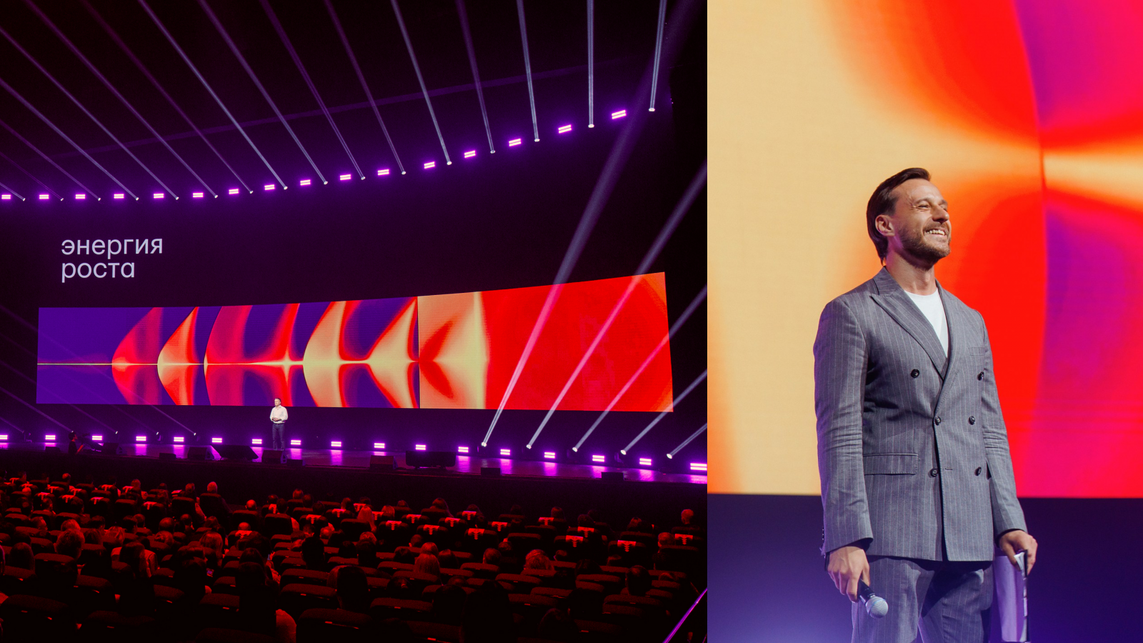 На подготовку было всего три недели. Задача — объединить два дня с деловым и неформальным настроением. Не разбивать, а собрать визуальную систему, которая будет чувствоваться и на экране киноконцертного зала, и на стойке регистрации у бассейна.
