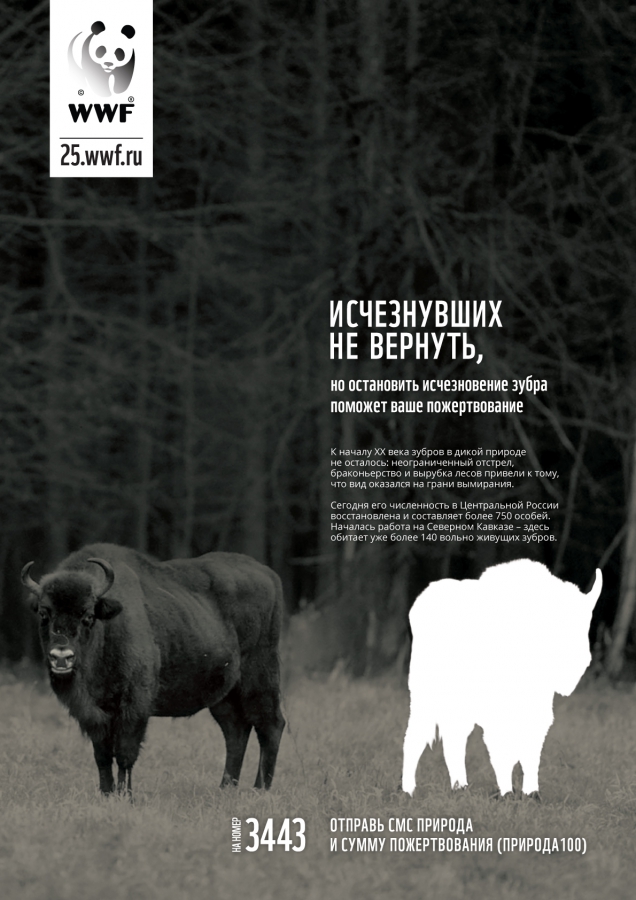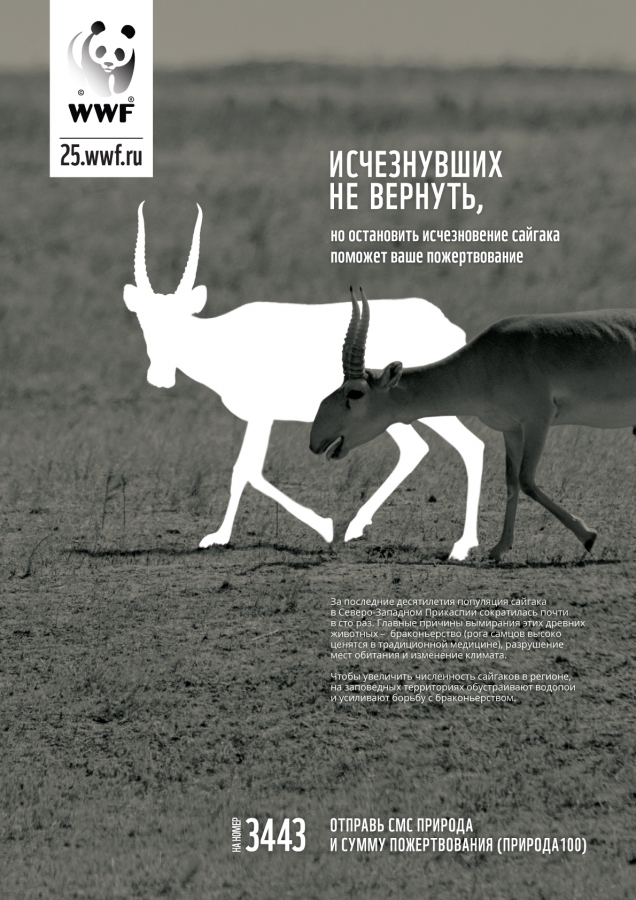 Перед нами стояла задача, используя юбилейный повод, рассказать об актуальных проектах Фонда, а также дать возможность людям принять в них участие. Мы решили драматизировать проблему исчезновения дикой природы через графический прием физического исчезновения редких видов животных с рекламных макетов.