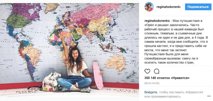 Ведущая популярного трэвел-шоу «Орел и Решка» на телеканале «Пятница!» Регина Тодоренко покидает проект. Об этом она заявила ровно через 4 года после прихода на канал.