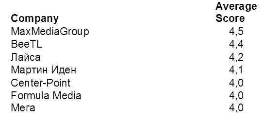 РА РОССТ , «Медиа Эксперт», «Аллен-Медиа», «Игроник Медиа». Оценки деятельности выставлялись только в отношении операторов, с которыми были реализованы проекты за последние 12 месяцев.