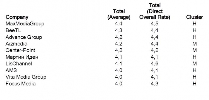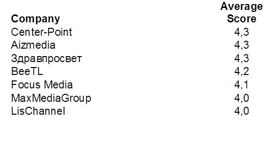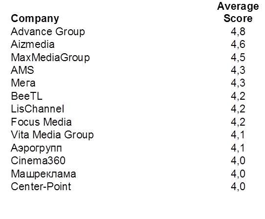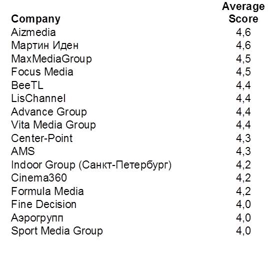 Анкетирование прошли эксперты из следующих агентств: Posterscope, Тotal View, Code of Trade ( Media Direction Group), StarLink,