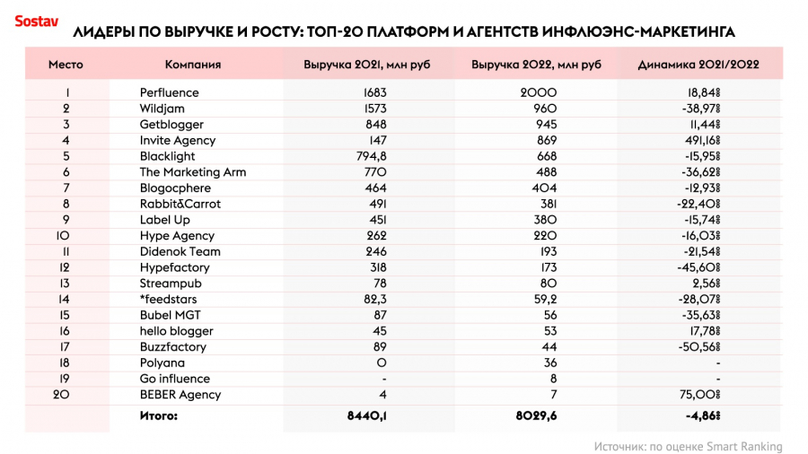Perfluence (2 млрд руб.), WildJam (960 млн руб.), GetBlogger (945 млн руб.), Invite Agency (869 млн руб.) и