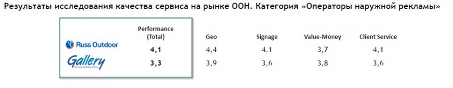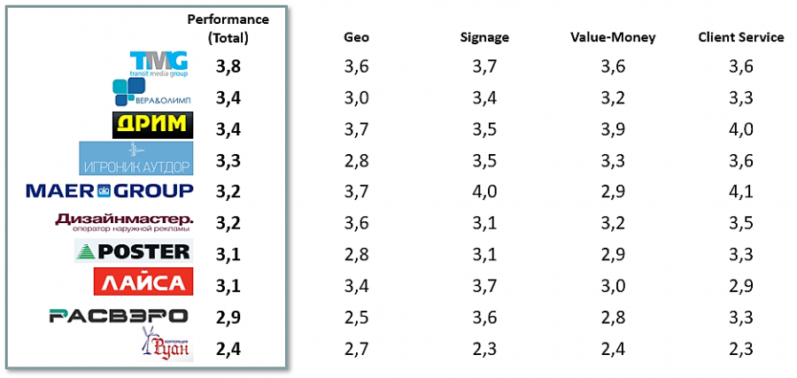Здесь безусловными лидерами остаются Russ Outdoor и Gallery. Респонденты так высоко оценивают их по параметрам стратификации (крупные игроки рынка OOH + большой штат + большой пул клиентов + национальное покрытие), что компания на третьем месте отстает от лидеров более чем в два раза.