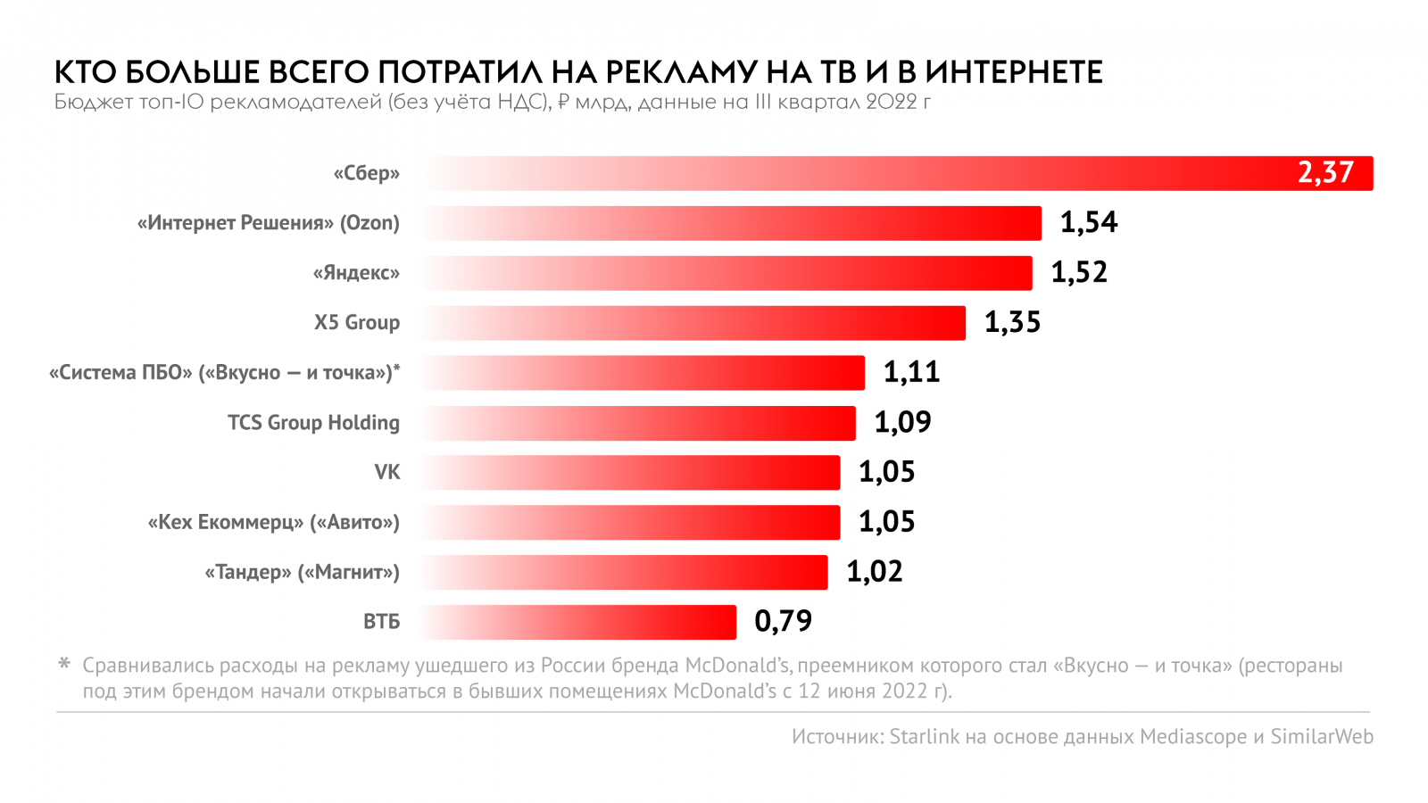 Издание РБК выпустило рейтинг рекламодателей на российском ТВ и в интернете по итогам третьего квартала этого года. В топ-10 вошли «Сбер», ритейлер Ozon, «Яндекс», сеть фастфуда «Вкусно — и точка», TCS Group Holding (представляет «Тинькофф-банк»), VK, «Авито», сеть «Магнит» и ВТБ. Рейтинг покинули Alibaba Group и Samsung, подсчитало агентство Starlink (входит в ГК «Родная Речь») на основе данных Mediascope и SimilarWeb.