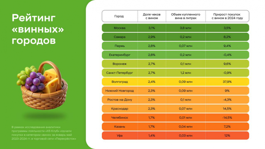Закрыла рейтинг Уфа — только в 1,4% случаев вино встречается в чеках жителей города. При этом спрос на вино в 2024 году вырос на 12%, что по темпам роста догоняет Краснодар (14,5%). Объем купленного вина составил 30 тыс. литров, а доля чеков с премиум-винами — 0,4% от всех чеков с вином.