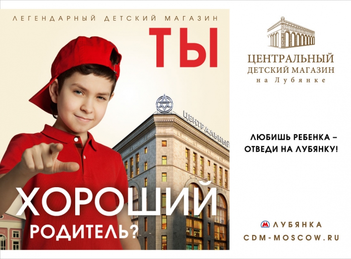 Реклама ЦДМ содержала, в частности, высказывания: «Хорошие родители водят своих детей на Лубянку. А вы хорошие родители?»; «Ты хороший родитель? Любишь ребенка — отведи в ЦДМ на Лубянку!» Кампания к открытию магазина была запущена на ТВ, радио, в метрополитене, интернете, а также на улицах Москвы.
