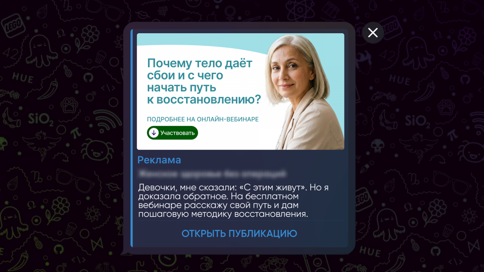 Анализ показал, что значительная часть рекламы в Telegram Ads, которая напрямую обращается к женщинам, по-прежнему строится вокруг традиционных представлений о женской аудитории. Рекламодатели чаще всего апеллируют к темам внешности, отношений и личной трансформации.