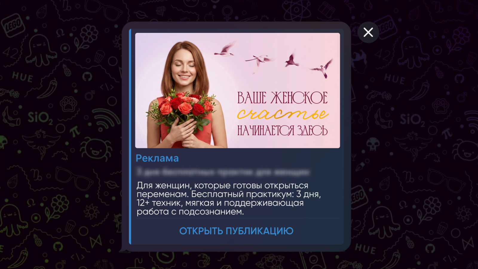 Вторая по распространенности категория объявлений связана с психологическими практиками и темами отношений. В таких рекламных сообщениях основной акцент делается на личностной трансформации и раскрытии «женственности».