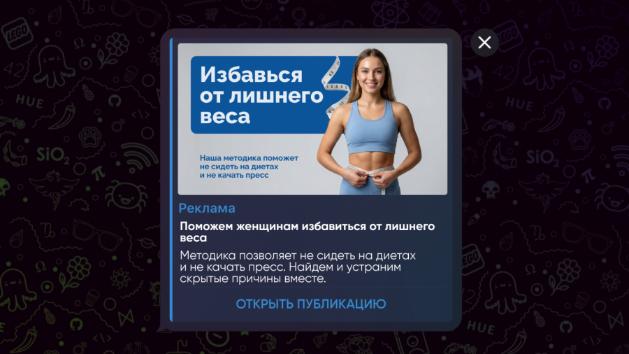 Чаще всего такие объявления ведут на закрытые Telegram-каналы или онлайн-марафоны, где участникам предлагают готовые программы тренировок, планы питания и регулярную мотивационную поддержку.