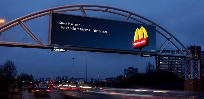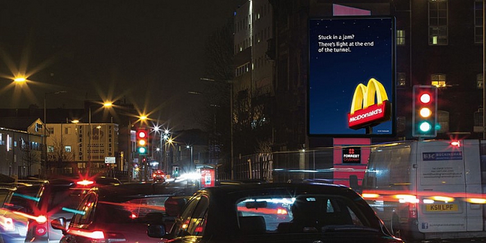 К примеру, во время пробок сообщение гласит: «Застрял в пробке? В конце туннеля есть свет». Узнаваемые изображения бренда и его продукты стимулируют аппетит водителей и призывают их к действию. Кампания будет запущена в 10 британских городах.