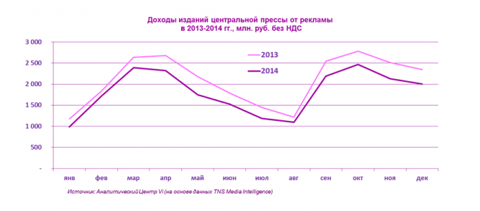 Уже начиная с октября наметилось серьезное ухудшение ситуации, а в ноябре и декабре рынок свалился относительно эталонной линии более чем на 30%. А кажущаяся стабильность в конце этого года объясняется тем, что провальным был и IV квартал 2013 г. Так, в декабре 2013 г. снижение доходов прессы относительно декабря 2012 г. составило почти 20%.
