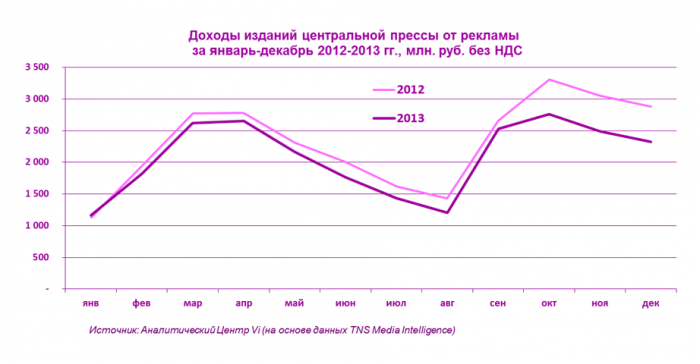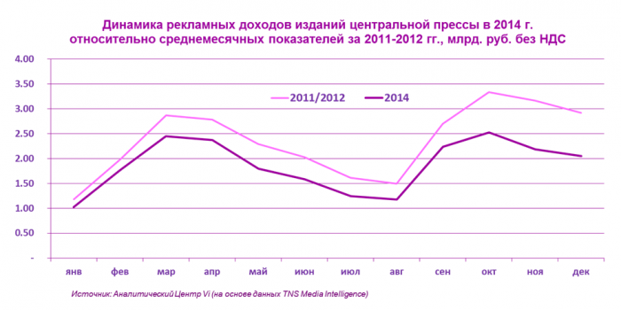 Взяв средние помесячные показатели 2011 и 2012 гг., мы получили сезонную эталонную линию годовой динамики доходов центральной прессы, с которой и сравнили динамику 2014 г.
