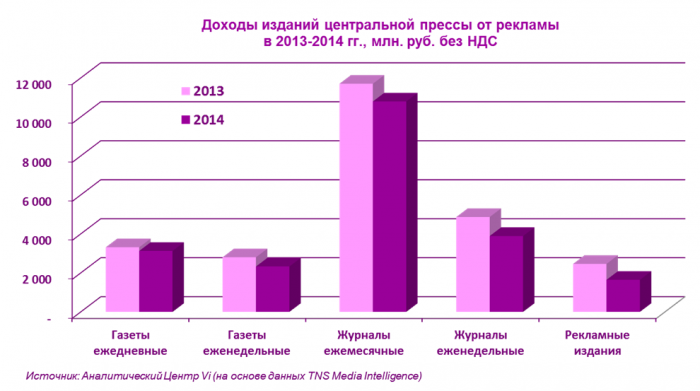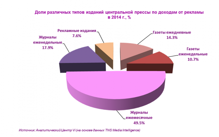 В результате некогда огромная доля рекламных изданий сократилась до 7,6% (9,8% - в 2013 г.), в меньшей степени уменьшились доли еженедельных изданий, а доля ежемесячных журналов вплотную приблизилась к 50%.