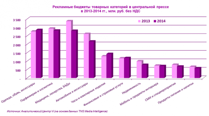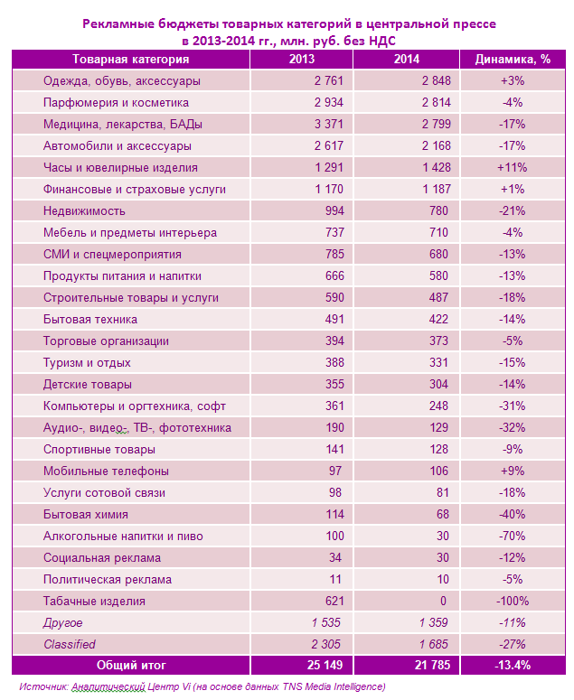 Лидирующая в 2013 г. товарная категория «Медицина, лекарства, БАДы» из-за 17% сокращения бюджетов опустилась на 3-е место, а лидирующее положение заняла товарная группа «Одежда, обувь, аксессуары» (+3%), потеснившая заодно и «Парфюмерию и косметику» (-4%). «Автомобили и аксессуары» остались на 4-м месте, сократив объемы рекламы на -17% (-11% в 2013 г.). Заметный рост показали лишь две товарные категории: «Часы и ювелирные изделия» (+11%) и «Мобильные телефоны» (+9%). Причем последние, в основном, из-за проседания в 2013 г. на 24% и благодаря лишь одному рекламодателю – SAMSUNG ELECTRONICS.