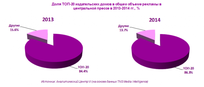 Так, доля 20 крупнейших ИД в доходах прессы от рекламы достигла 86,3%.
