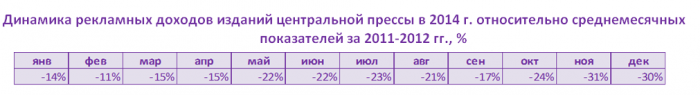 Несмотря на резкое ухудшение экономической ситуации в России в конце прошедшего года, объем рекламы в центральной прессе в октябре-декабре 2014 г. по отношению к соответствующим месяцам 2013 г., вопреки пессимистическим ожиданиям, снизился не так уж и сильно по сравнению с предыдущими месяцами, когда кризисные явления еще не проявились в полную силу.