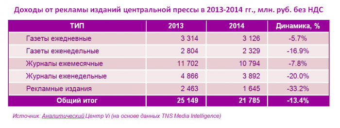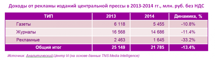 Прошедший год, по сравнению с 2013 г., не внес в расстановку сил в сегменте существенных изменений. Все так же очень быстрыми темпами сокращается объем рекламы в рекламных изданиях, а еженедельные газеты и журналы теряют доходы заметно быстрее, чем ежедневные газеты и ежемесячные журналы. Такая же тенденция отмечалась и в 2013 г.