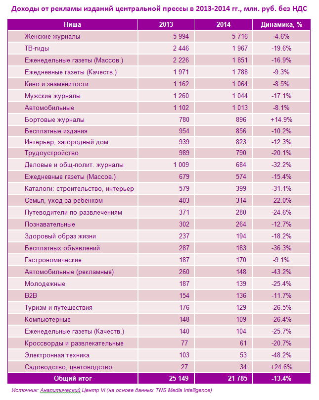 Ну, а наибольшее сокращение доходов среди нерекламных изданий, как и в 2013 г., постигло издания компьютерной тематики, издания по электронной технике и по туризму и отдыху. Примерно с такой же скоростью объемы рекламы сокращаются еще в ряде ниш, в частности, в «Путеводителях по развлечениям» (закрылась печатная версия журнала «Афиша»), качественных еженедельных газетах и в изданиях по уходу за ребенком. Рекордное для этой ниши сокращение доходов зафиксировано у деловых еженедельников.