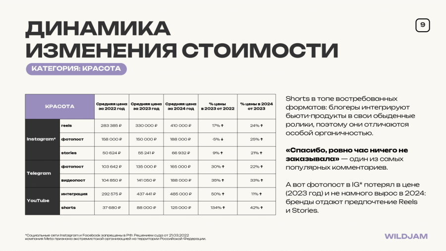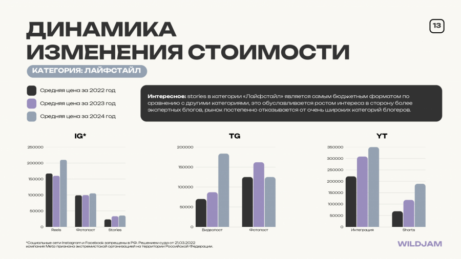 Чтобы разобраться в происходящем, команда агентства WildJam провела исследование. В фокусе — динамика цен на рекламу у инфлюенсеров за последние три года (2022−2024): какие форматы подорожали, какие, наоборот, просели в стоимости, и с чем это может быть связано.