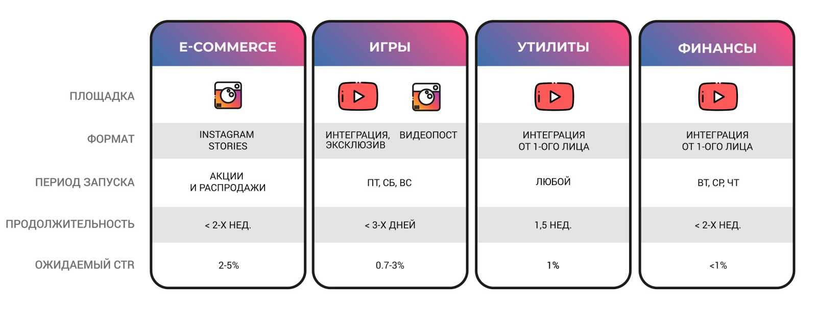 Сегодня реклама у лидеров мнений играет важную роль в мультиканальном продвижении продуктов. Все чаще её применяют в стратегическом планировании кампаний и достижении маркетинговых целей. Маркетинг влияния — это, в первую очередь, платформы размещения, среди которых Twitter, Telegram, Twitch и Facebook. Однако наиболее популярными на данный момент являются YouTube и Instagram. Именно о них мы расскажем в разрезе разных вертикалей мобильных продуктов.