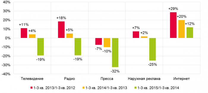 Динамика рекламных бюджетов основных медиа в 1-3 кв. 2013-2015 гг., % к предыдущему году