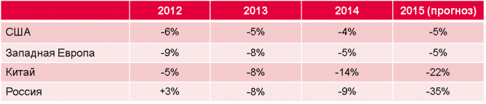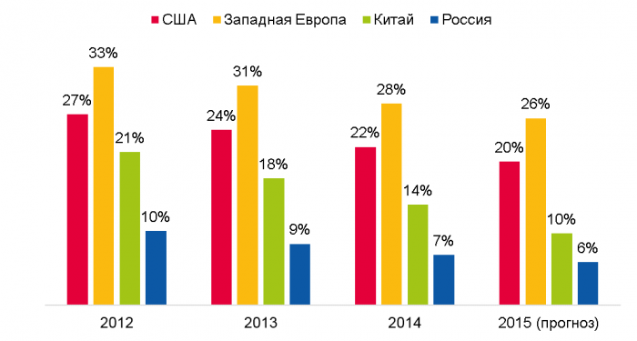 Доля прессы в рекламных расходах по всем медиа в США, странах Западной Европы, Китае и России в 2012-2015 гг. (расчет по текущим ценам в долларах США)