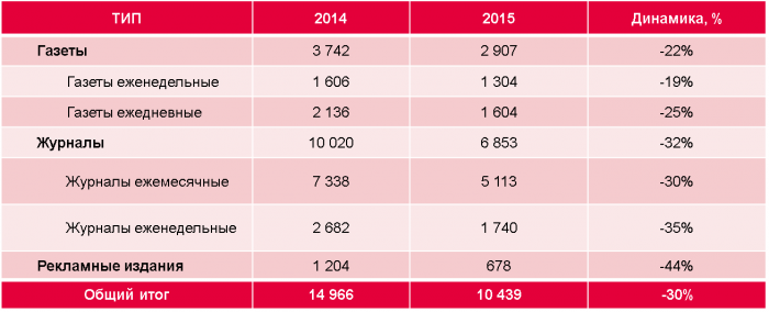 По данным АКАР, объем бюджетов в российской печатной прессе (суммарно по центральному и региональному сегментам) в 1-3 кварталах 2015 г. сократился на 32% по отношению к аналогичному периоду прошлого года.