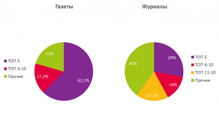 Вообще в условиях кризиса заметно перераспределение рекламных бюджетов в пользу наиболее крупных изданий. На ТОП-10 газет в 1-3 кв. 2015 года пришлось порядка 79% всех рекламных бюджетов, расходуемых на издания данного типа (76% в 1-3 кв. 2014 года). Доля ТОП-10 журналов в рассматриваемом периоде составила 42% от всего объема вложений в журнальную рекламу (40% в 1-3 кв. 2014 г.).