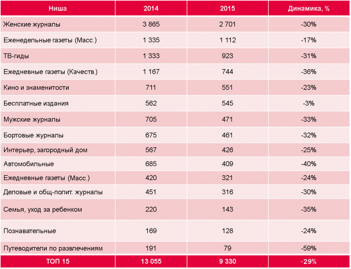 Общее сокращение по журналам в 1-3 кв. 2015 г. составило 32%. При этом у пятерки крупнейших журналов (Cosmopolitan, Elle, Vogue, «7 дней», «Антенна-Телесемь») объем рекламных доходов уменьшился по сравнению с аналогичным периодом прошлого года на 28%.