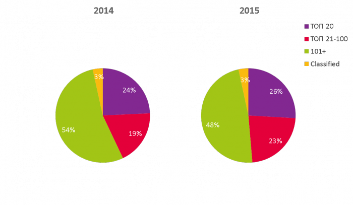 Совокупная доля двадцати крупнейших рекламодателей центральной прессы в 1-3 кв. 2015 г. выросла на 2 п.п. по сравнению с аналогичным периодом прошлого года и составила 26%. Доля группы рекламодателей, находящихся по объему бюджетов на местах с 21 по 100, также увеличилась с 19% до 23%. Сокращение бюджетов небольших рекламодателей (группа «101+») было наиболее заметным (-36% к январю-сентябрю 2014 г.), в результате чего доля этой группы упала с 54% до 48%.