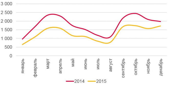 Диаграмма 1.Помесячная динамика рекламных бюджетов в центральной прессе в 2014-2015 гг.,