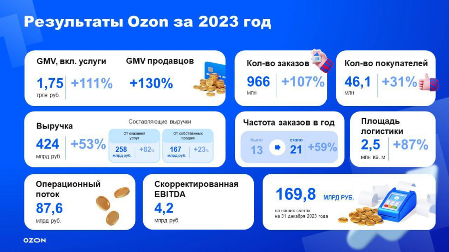 Выручка Ozon в октябре-декабре 2023 года выросла на 37%, до 127,9 млрд руб., по итогам всего 2023-го — на 53%, до 424,3 млрд руб. Показатель поднялся за счёт увеличения комиссии маркетплейса и быстрого роста выручки от рекламы и финансовых услуг, говорится в отчёте.