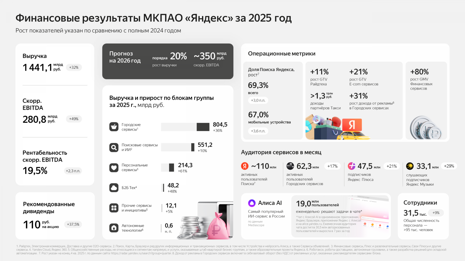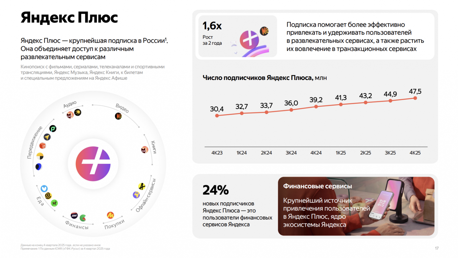 Ядро блока «Персональные сервисы» — мультиподписка «Яндекс Плюс», которая, как сказано в отчете, обеспечивает стабильный рост пользовательской базы и низкую стоимость привлечения. Число подписчиков «Яндекс Плюса» достигло 47,5 млн, увеличившись на 21% год к году.