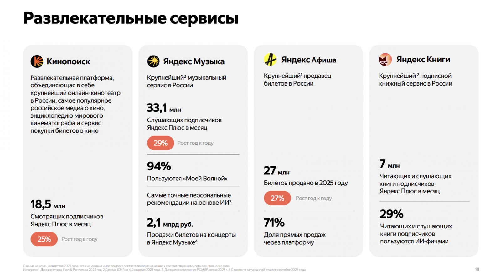 В четвертом квартале 2025 года «Кинопоиск» представил обновление сервиса, который теперь работает как платформа и продает подписки партнеров. Оборот прямых продаж билетов на «Яндекс Афише» и через другие сервисы «Яндекса» за 2025 год вырос на 62% год к году — до 46,6 млрд руб., а продажи на сайтах партнеров увеличились на 48% год к году — до 13,4 млрд руб.