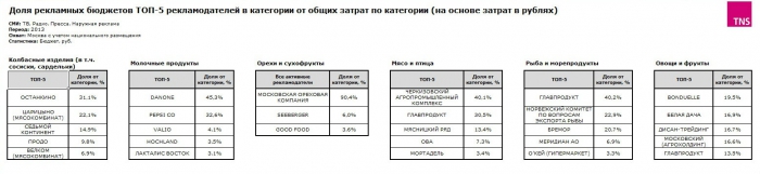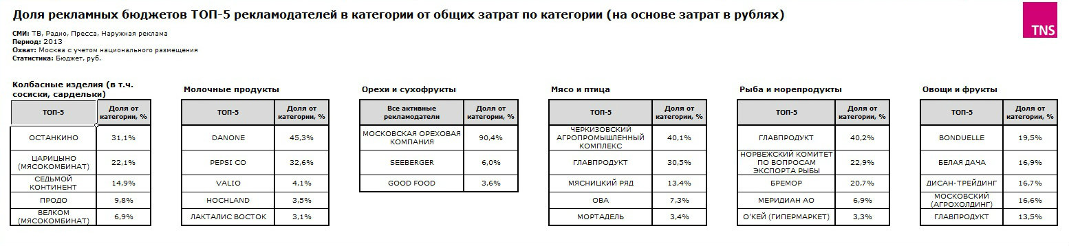 Стоит также отметить, что сами по себе товарные категории, оставшиеся без импорта, довольно мало тратятся на собственное продвижение. Они занимают незначительную долю на российском рекламном рынке: колбасные изделия — 0,3% от всего рынка рекламы, овощи и фрукты — 0,13%, мясо и птица — 0,06%, рыба и морепродукты — 0,04%, орехи и сухофрукты — 0,01%. Самая большая доля у молочной продукции — 2,37% рекламного рынка.