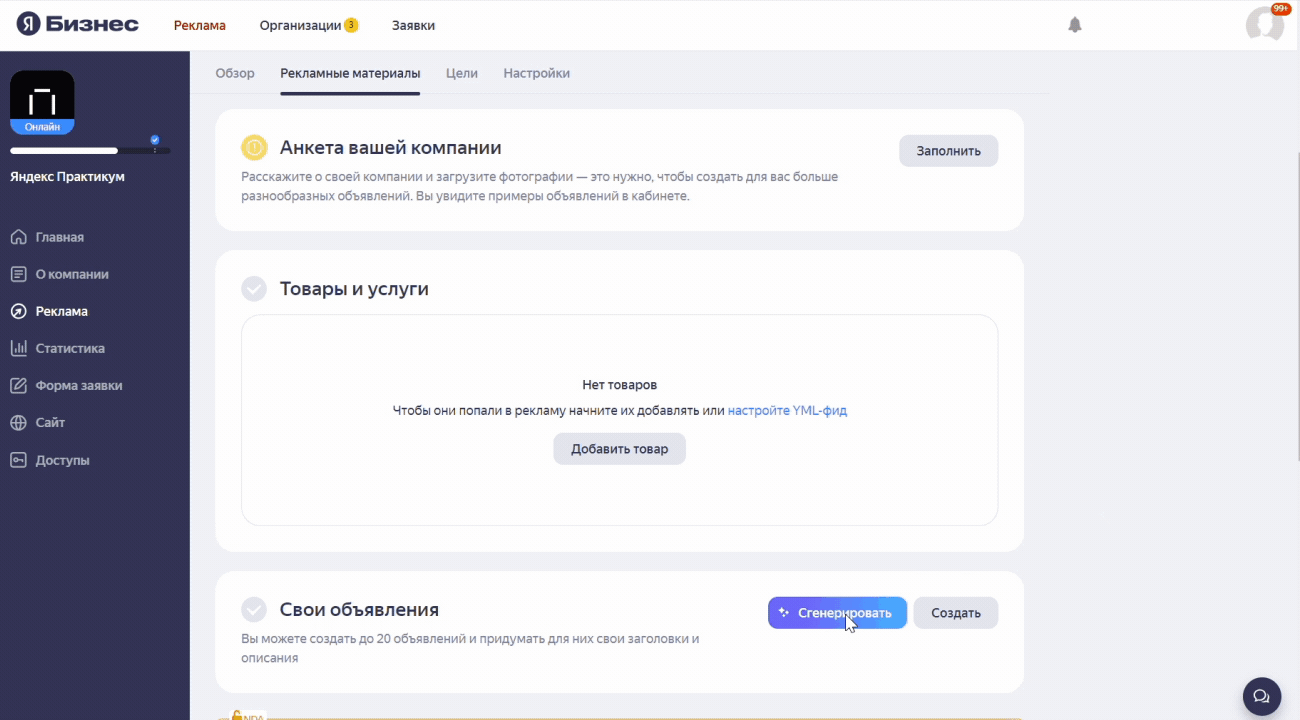 Для получения готового объявления нужно нажать на кнопку «Сгенерировать» на вкладке «Рекламные материалы» в «Яндекс Бизнесе». Языковая модель напишет «продающий заголовок» и основное сообщение, а диффузионная нейросеть YandexART создаст иллюстрацию.