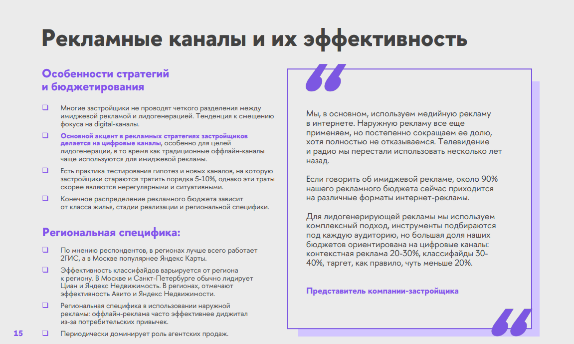 2. Изучить, как застройщики оценивают эффективность разных рекламных каналов для продвижения конкретных объектов или собственного бренда на рынке.