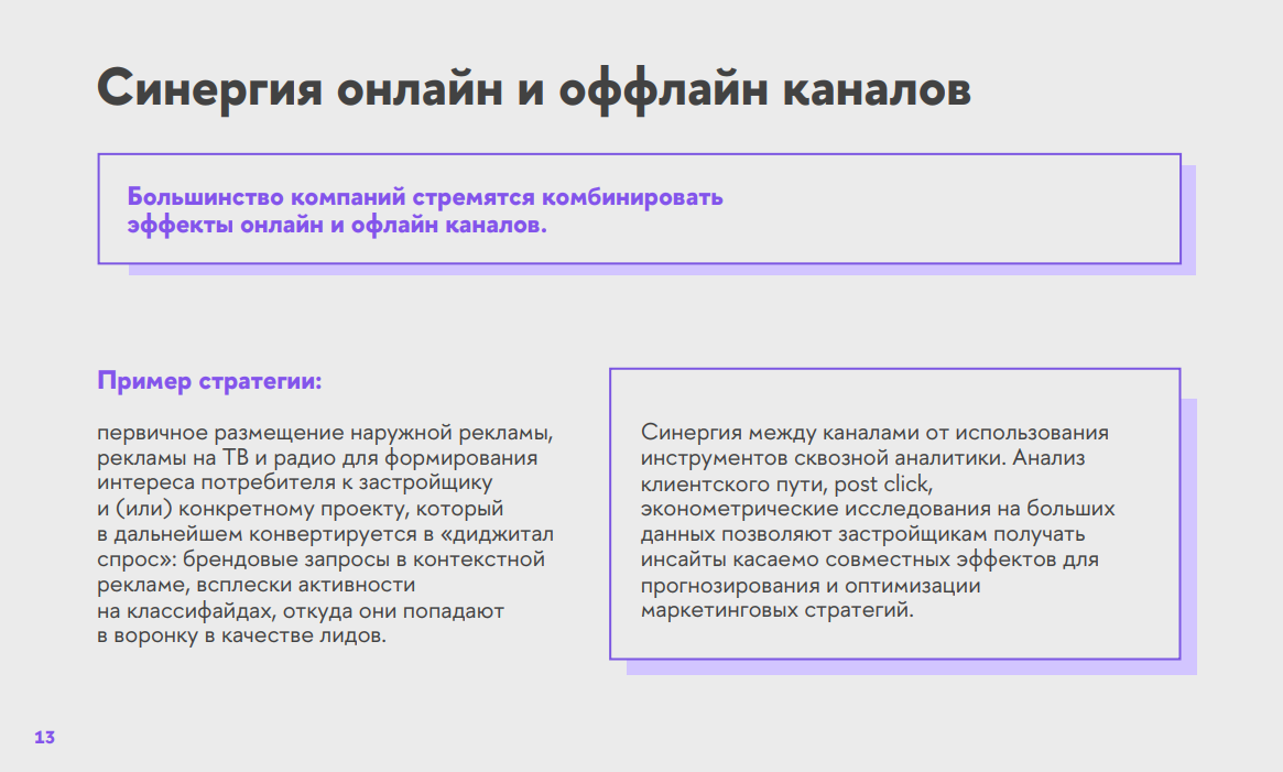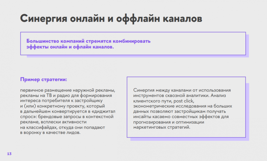 Телевидение и радио практически исчезли из медиамикса девелоперов, но для имиджевых целей активно используются медийная реклама и продвижение через цифровые платформы. Синергия между каналами помогает увеличивать эффективность кампаний.