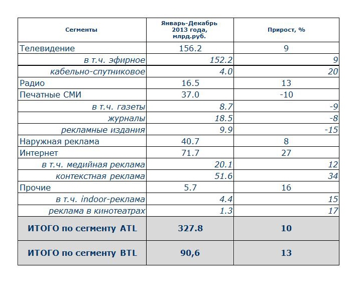 Объем рекламы в средствах ее распространения (за вычетом НДС) в России составил 327,8 млрд. рублей, увеличившись в 2013 году на 10,1%, свидетельствуют данные Ассоциации Коммуникационных Агентств России (АКАР). По сравнению с 2012 годом рекламный рынок замедлился – тогда рост составлял 13%. Все медиа по итогам 2013 года показали положительную динамику кроме прессы, падение которой достигло 10%.