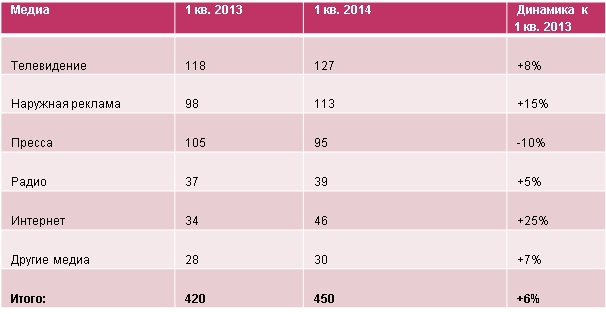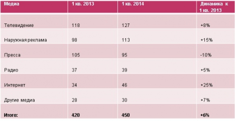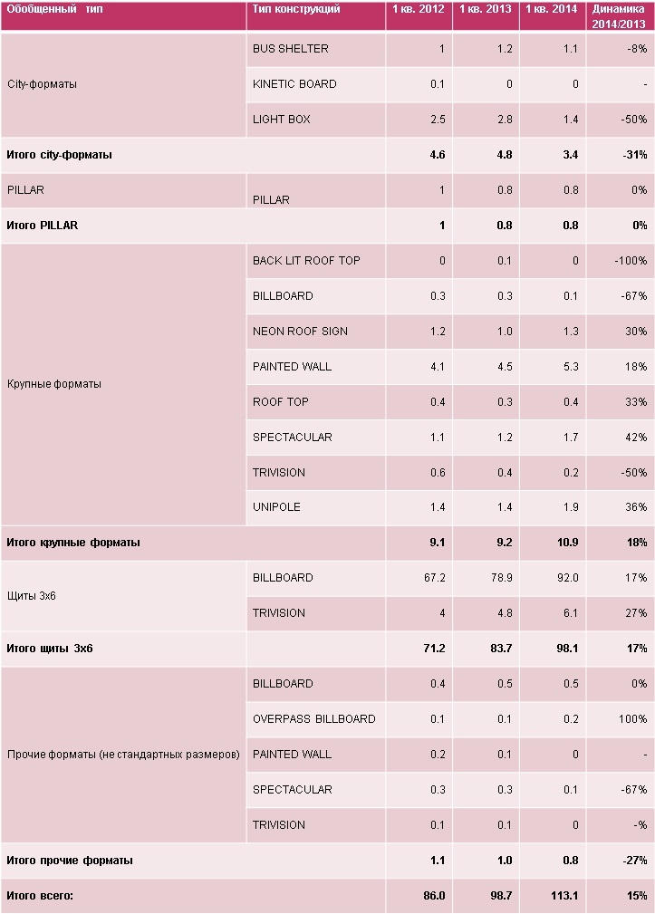 Проводимая местными властями политика по регулированию сегмента наружной рекламы пока не оказала значительного влияния на динамику сегмента. В 1 кв. 2014 года объем наружной рекламы составил 113,1 млн. руб. без НДС, что на 15% больше показателей предыдущего периода. Драйверами роста рассматриваемого сегмента, как и в прошлом году, стали форматы 3х6 и крупные форматы, являющиеся самыми популярными в большинстве городов.