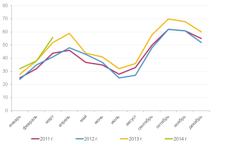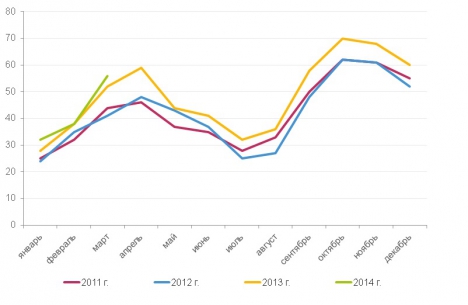 Динамика телерекламных бюджетов Самары, 2011-2014 гг. млн. руб. без НДС по месяцам