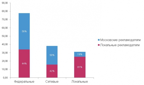 Основным драйвером роста ТВ сегмента стали бюджеты «московских» рекламодателей (рекламодатели, покупающие рекламные возможности через московские офисы селлеров). Доля бюджетов этих рекламодателей в регионе менее 50%. Несмотря на преобладание рекламы локальных рекламодателей, регион не перестает быть привлекательным для «московских» рекламодателей, об этом говорит ежегодно увеличивающаяся доля их бюджетов. «Московские» рекламодатели, в силу специфики своего размещения, отдают предпочтения федеральным и сетевым каналам, что обеспечивает стабильный рост доли этих каналов в среднем на 8%.