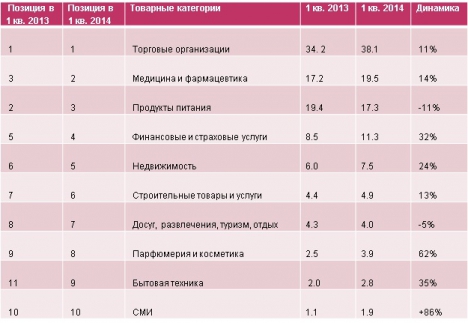 ТОП-10 товарных категорий на телевидении Самары немногим отличается от представленных в других регионах. Первое место занимают «торговые организации». Объем данной категории увеличился на 11%, по сравнению с аналогичным периодом 2012 года, рост обеспечили магазины по продаже парфюмерии и косметики (Yves Rocher и РИВ ГОШ), которые в 1 кв. 2014 года запустили рекламные кампании.
