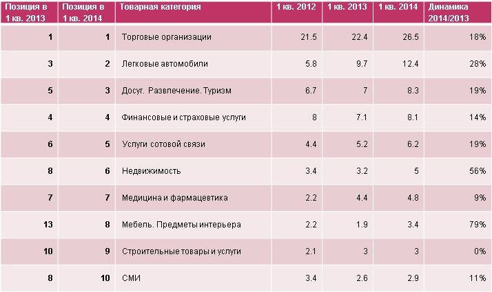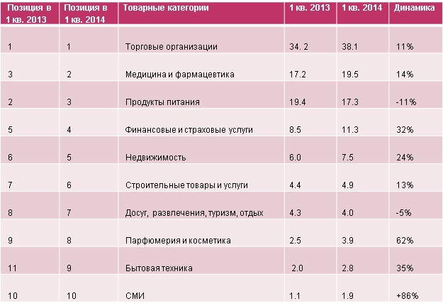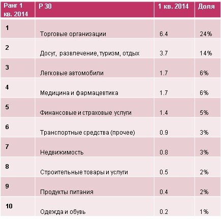 Возглавляет ТОП товарных категорий «торговые организации» с долей в 24%, состав категории практически идентичен рассмотренной в разделе наружной рекламы, основные доходы категории приносят крупные сетевые магазины (группа компаний X5 Retail Group, METRO GROUP) и сетевые магазины бытовой техники (Эльдорадо, М.Видео, IKEA и т.д.).