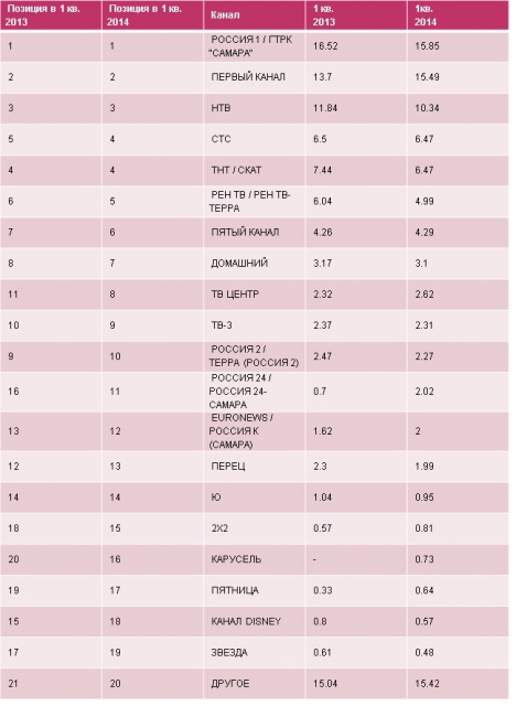 В первом квартале 2014 года объем телерекламного сегмента Самары составил 127 млн. руб. без НДС, что на 7% больше показателей 1 кв. 2013 г., тогда рост сегмента составлял 17%. Несмотря на замедление темпов роста, положительная сезонная динамика сохраняется.