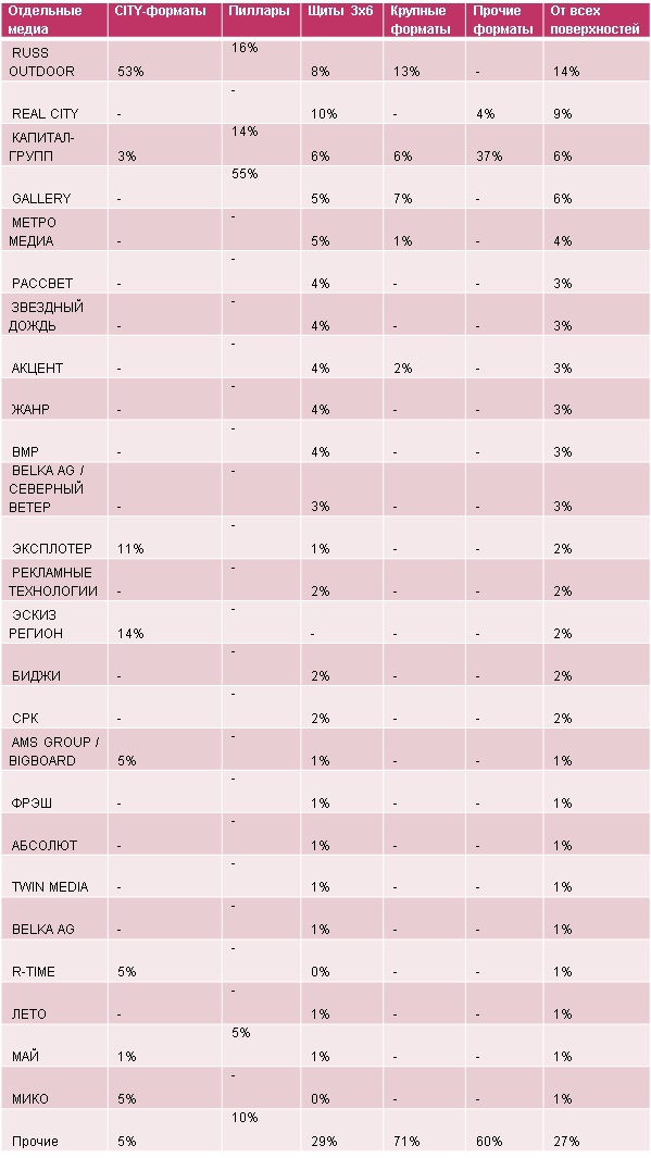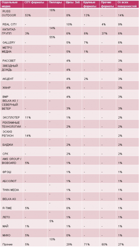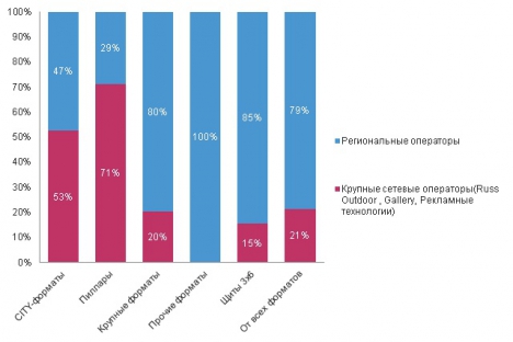 В конце 2013 года на рынке наружной рекламы Самары насчитывалось более 150 игроков. Подавляющее большинство - мелкие, владеющие несколькими конструкциями, собственники. На долю крупных сетевых операторов (Russ Outdoor, Gallery и Рекламные технологии) приходится всего лишь 27% всех рекламных поверхностей, что существенно ниже показателей других крупных городов. City-форматы и пиллары – единственные, где доля сетевых операторов более 50%.