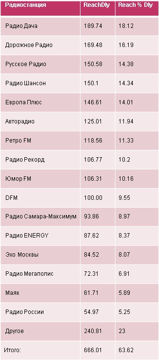 Со второй половины 2012 года TNS исключил из своего мониторинга ряд обозначенных нами региональных радиостанций, поэтому сравнить их долю с другими не представляется возможным. Из тех, что остались в мониторинге лидирующие позиции по доле охвата заняли сетевые игроки (Радио Дача, Дорожное Радио и Русское Радио). Весьма неплохие показатели по охвату продемонстрировали местные станции: Самара-Максимум (11 строчка рейтинга) с охватом 8,9% и Мегаполис - 6,9%. Большее количество местных радиостанций попали в категорию «другое», их суммарный охват составил 23% (см. таблицу 5).