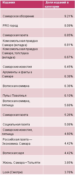 Первое место занимает «Самарское обозрение», одно из крупнейших газетных изданий в области, выходит несколько раз в неделю тиражом 16 816 экземпляров. В 2013 году газета заявила о видоизменении издания и запуске приложения для планшетных компьютеров, что позволит немного увеличить читательскую и рекламную аудитории, а также участвовать в формировании в регионе нового сегмента СМИ. На втором месте - бесплатная газета «PRO Город», выходящая еженедельно тиражом 265 тыс. экземпляров. Первую тройку рейтинга замыкает «Самарская газета» - старейшая в регионе, выходившая с 1884 по 1906 года и возобновившая свою работу в 1991 году, с тиражом 7 000 экземпляров.