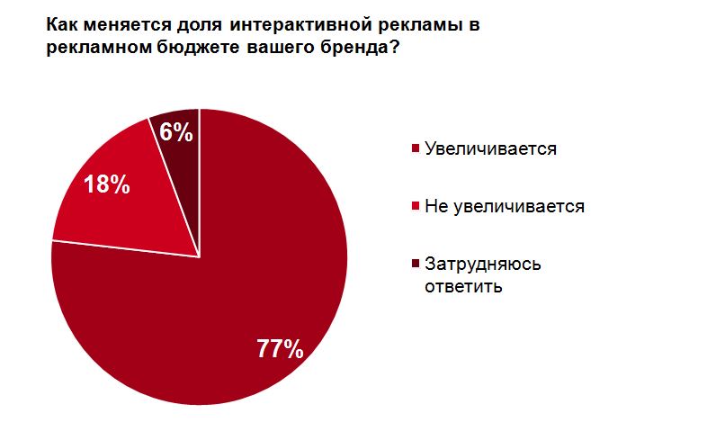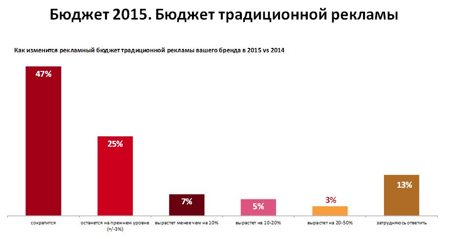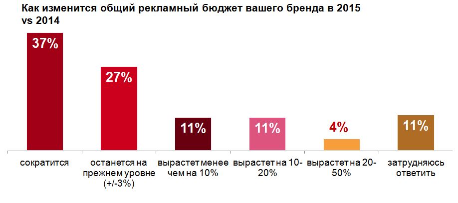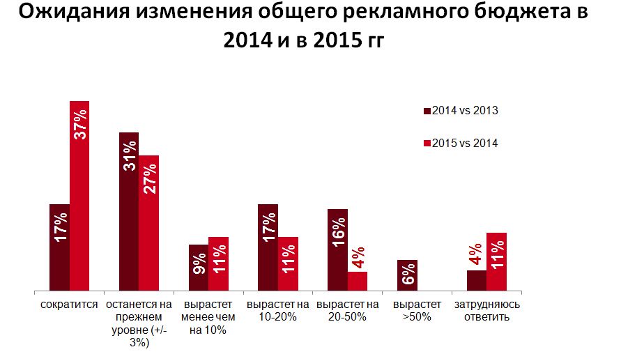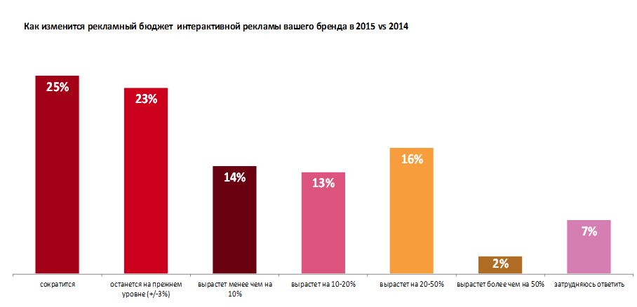 В 2014 году у пятой части рекламодателей общий бюджет сократился, у аналогичного количества остался неизменным. Зато у 44% компаний расходы на продвижение их бренда выросли, причем у большинства (21%) из них рост составил 10–20%. Опрос показал, что в прошлом году у 64% респондентов увеличились расходы на интерактивную рекламу и у 35% уменьшились оффлайн-бюджеты.